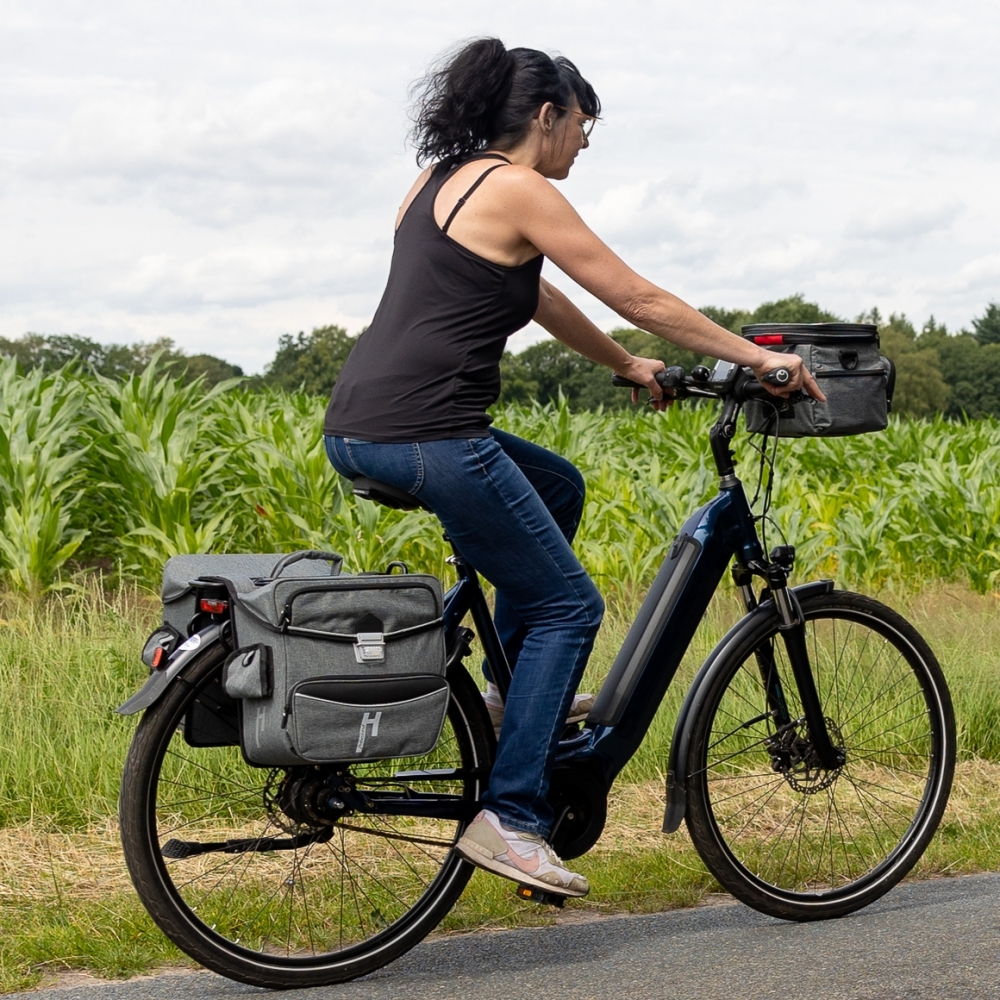 Die Haberland Doppeltasche Max überzeugt durch viel Stauraum, clevere Details und einfache Befestigung. Zwei große Hauptfächer sowie zusätzliche Außen- und Innenfächer bieten Platz für alles Wichtige im Alltag oder auf Tour. Dank ausklappbarer Trinkflaschenhalter und reflektierender Metallschlösser ist sie besonders praktisch und sicher. Die Tasche wird wahlweise mit der Federklappe des Gepäckträgers oder mit Klettbändern befestigt und bleibt durch die seitliche Fixierung immer stabil am Fahrrad. Ideal für alle, die Funktion und Komfort schätzen.