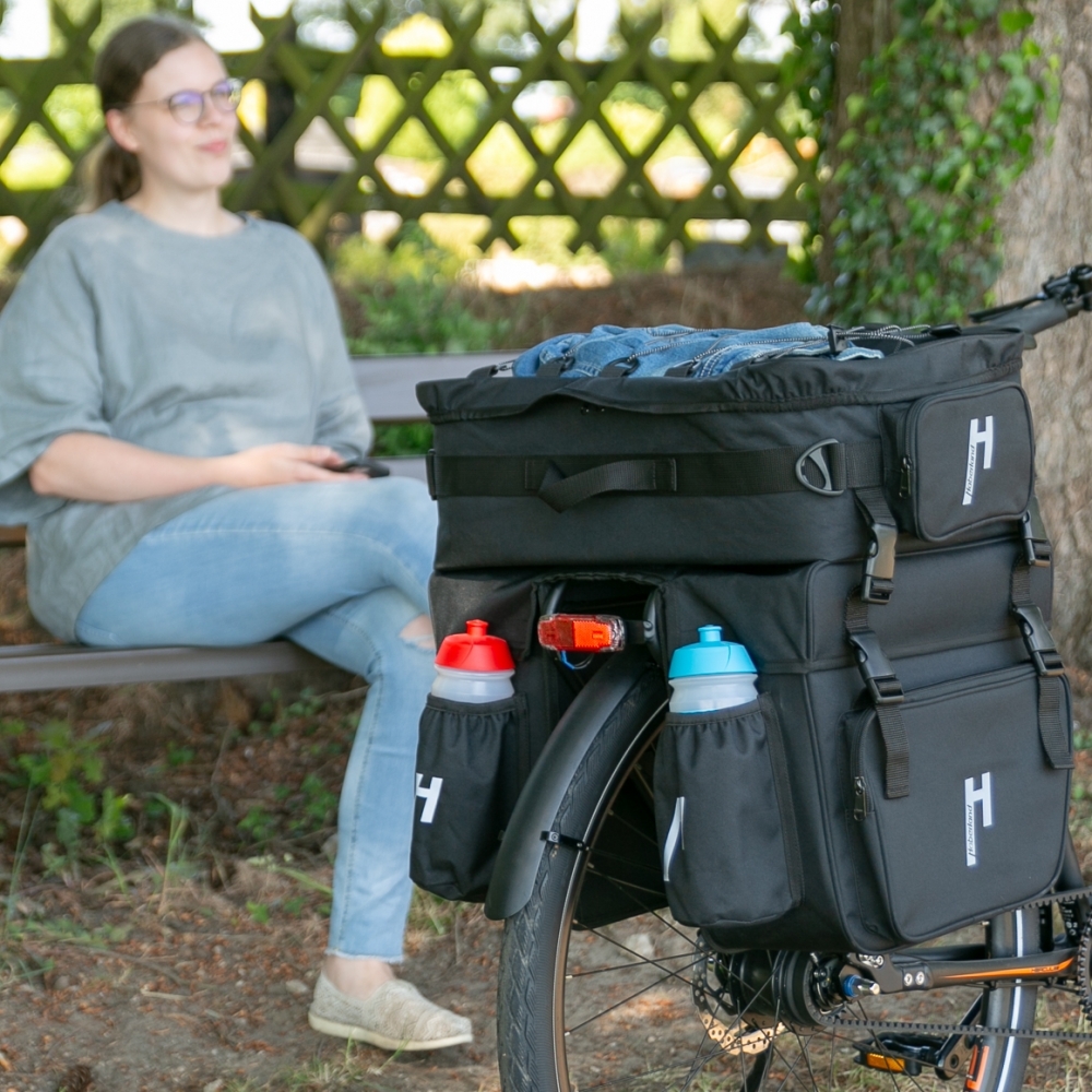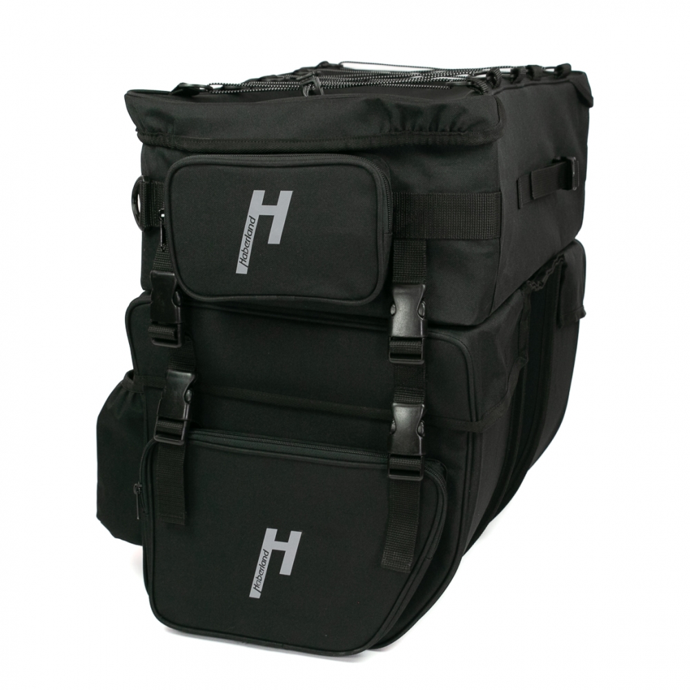 Haberland überzeugt mit einer clever durchdachten Lösung für alle, die gerne auf große Tour gehen: Die Haberland TOURMASTER XXL ist ein praktisches Komplett-Set, das sich durch besonders viel Stauraum und durchdachte Details auszeichnet. Bestehend aus einem geräumigen Topcase und einer stabilen Doppeltasche ist diese Kombination ideal für Radreisen, Wochenendtouren oder längere Pendelstrecken geeignet. Die Klettbandbefestigung sorgt für sicheren Halt auf dem Gepäckträger, während das beiliegende Aussteifungsmaterial für eine stabile Form der Taschen sorgt – oder bei Nichtgebrauch einfach entfernt werden kann, um Platz zu sparen.