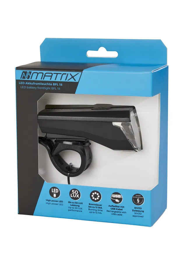 Die Matrix LED Akkufrontleuchte BFL 18 ist ein leistungsstarkes und zuverlässiges Fahrrad-Frontlicht für den täglichen Einsatz sowie für längere Fahrten bei Dunkelheit. Mit einer Leuchtstärke von bis zu 50 Lux sorgt sie für eine sehr gute Ausleuchtung der Fahrbahn und erhöht die Sichtbarkeit im Straßenverkehr deutlich. Damit eignet sich diese LED-Frontleuchte ideal für Stadtfahrten, Pendlerstrecken und Touren in der Dämmerung oder bei Nacht.